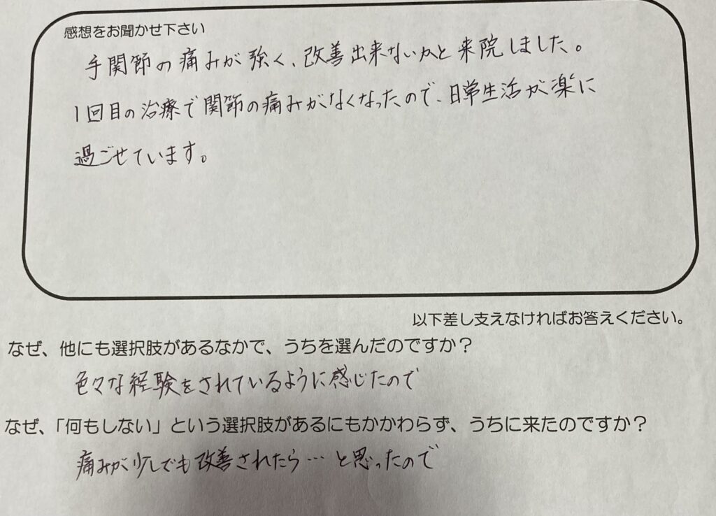 ⇒どこにいっても、変わらない痛みが少しでも改善されたら…と考えていたので。